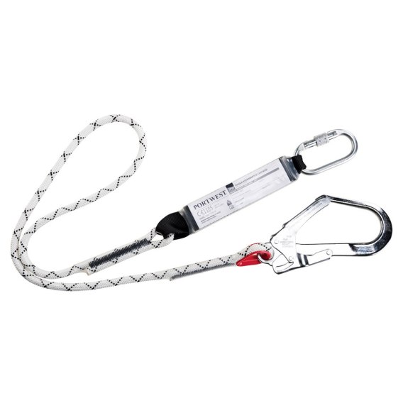 Amortyzator bezpieczeństwa z linką z oplotem rdzeniowym wyposażona jest w hak do rusztowania i karabińczyk. Całkowita długość zestawu wynosi 180cm.