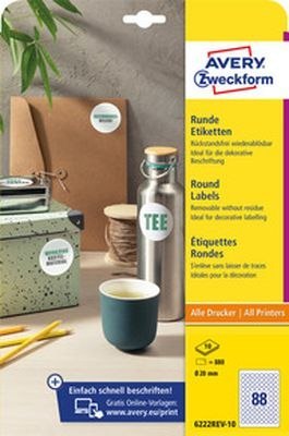 Etykiety o nietypowych kształtach, A4, 10 ark./op., Q20 mm, okrągłe, trwałe, AVERY ZWECKFORM, 6222.10.01