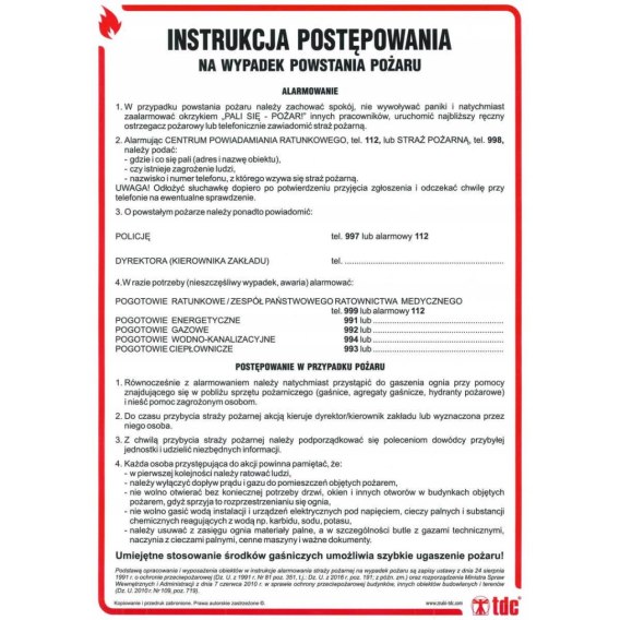 INSTRUKCJA PPOŻ - INSTRUKCJA POSTĘPOWANIA W PRZYPADKU POWSTANIA POŻARU - DB 003 DN CN - Rozmiar 24,5 x 35 cm, płyta cienka PCV - 0,5 mm. Znak nieświecący. Posiada taśmę dwustronną do mocowania.