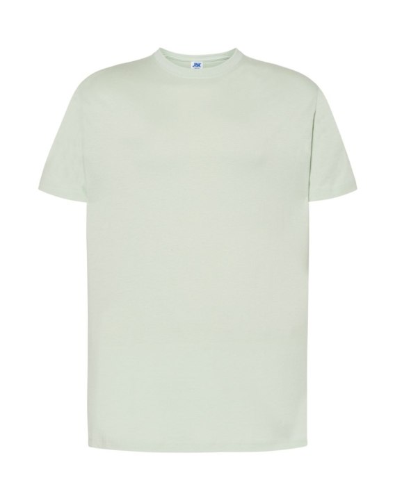 T-shirt męski z krótkim rękawem. Brak bocznych szwów. Podwójne szwy na ramionach. Wzmocniony lycrą ściągacz. Taśma wzmacniająca. 100% bawełna stabilizowana.