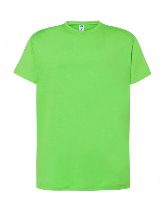 T-shirt męski z krótkim rękawem. Brak bocznych szwów. Podwójne szwy na ramionach. Wzmocniony lycrą ściągacz. Taśma wzmacniająca. 100% bawełna stabilizowana.