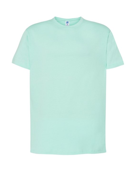 T-shirt męski z krótkim rękawem. Brak bocznych szwów. Podwójne szwy na ramionach. Wzmocniony lycrą ściągacz. Taśma wzmacniająca. 100% bawełna stabilizowana.