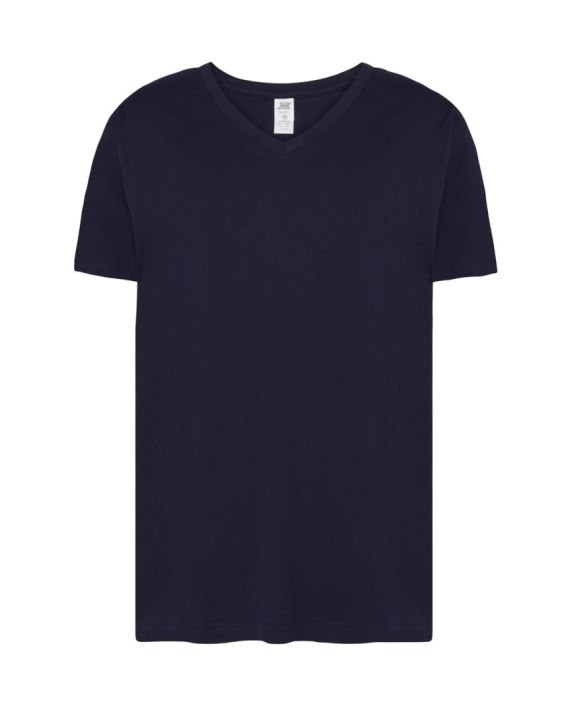 T-shirt męski typu v-neck. Dopasowany do sylwetki. Wzmocniony lycrą ściągacz. Taśma wzmacniająca. 100% bawełna..