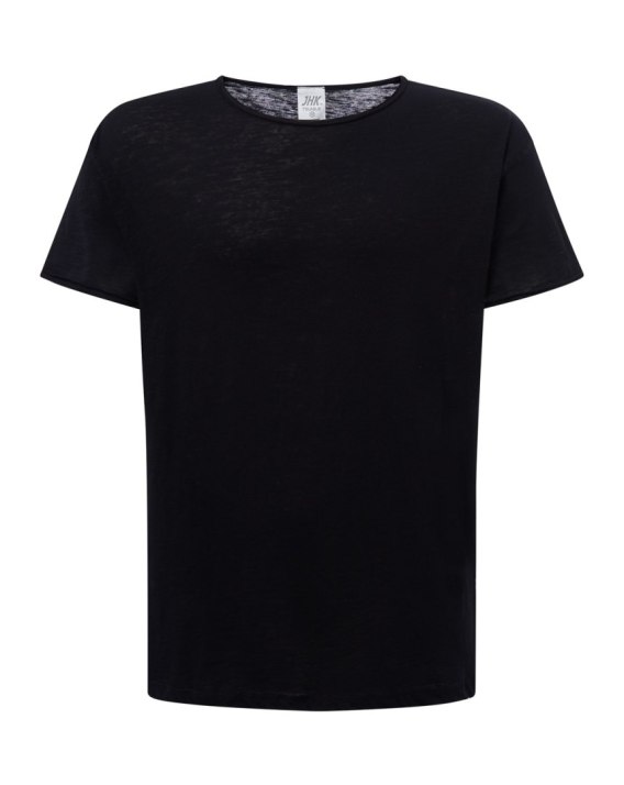 Męski T-shirt z krótkim rękawkiem typu SLUB. Rękawki i dekolt modnie wykończone. 100% bawełna.